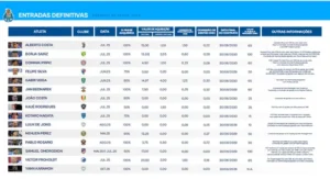 No documento oficial, acessível no site do clube, estão discriminadas todas as entradas e saídas de jogadores, com valores de transferências, percentagens de passe, comissões e cláusulas de rescisão.